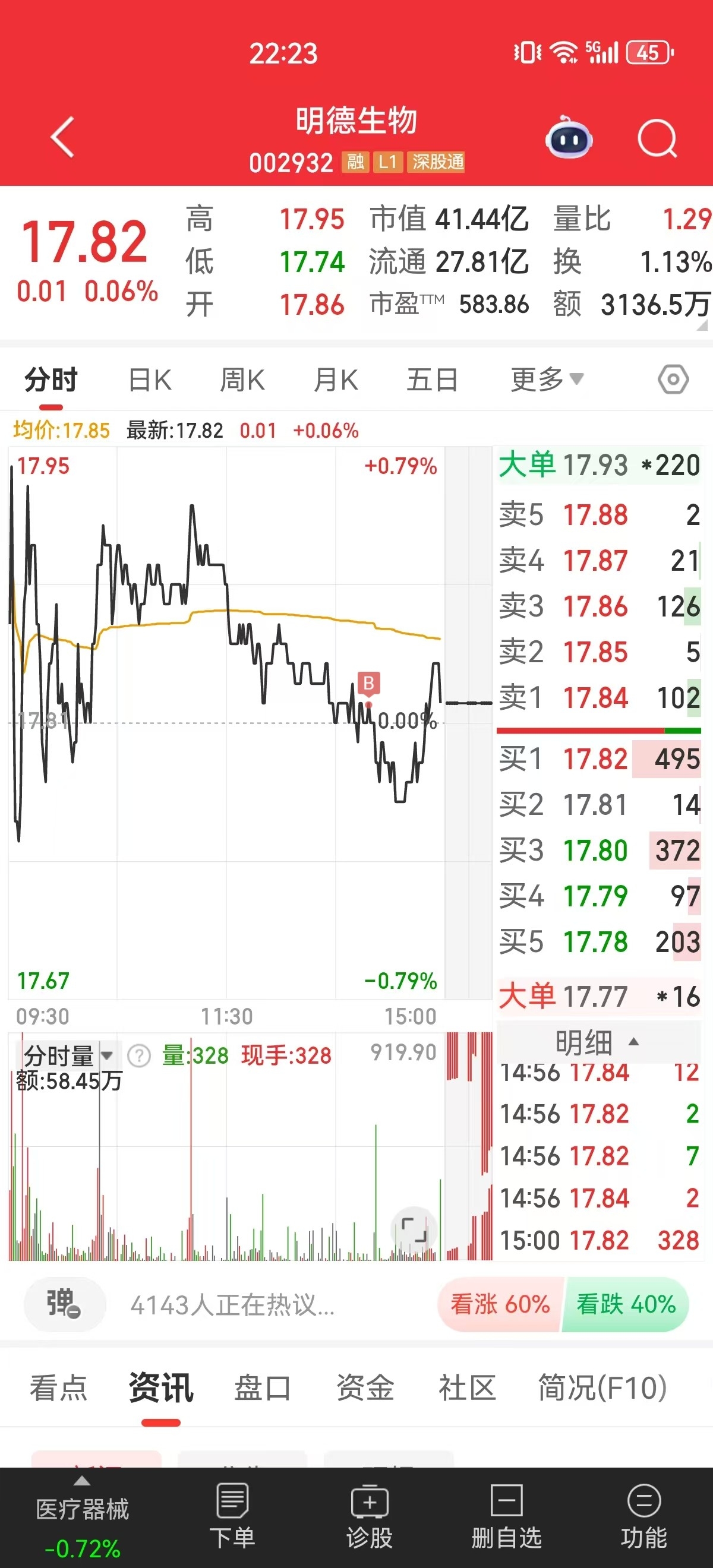 $明德生物(SZ002932)$ 周二买入002932 明德生物,智能医疗+AI应用+高分红,长期的调整后,底部形成筑底,今天试突20日线,预期会有不错表现