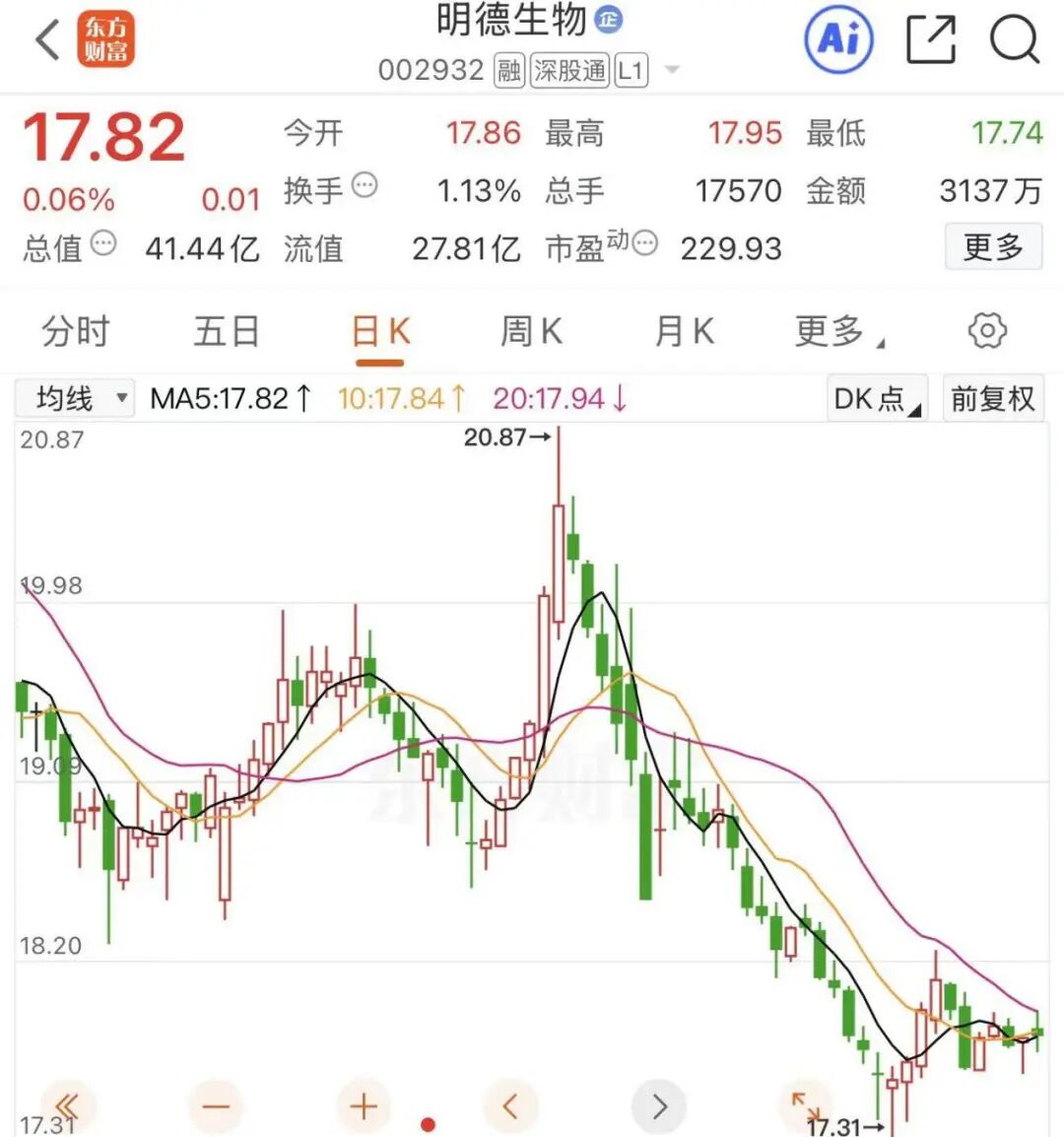 截至12月30日收盘,明德生物最新股价报17.82元/股,总市值为41.44亿元。
