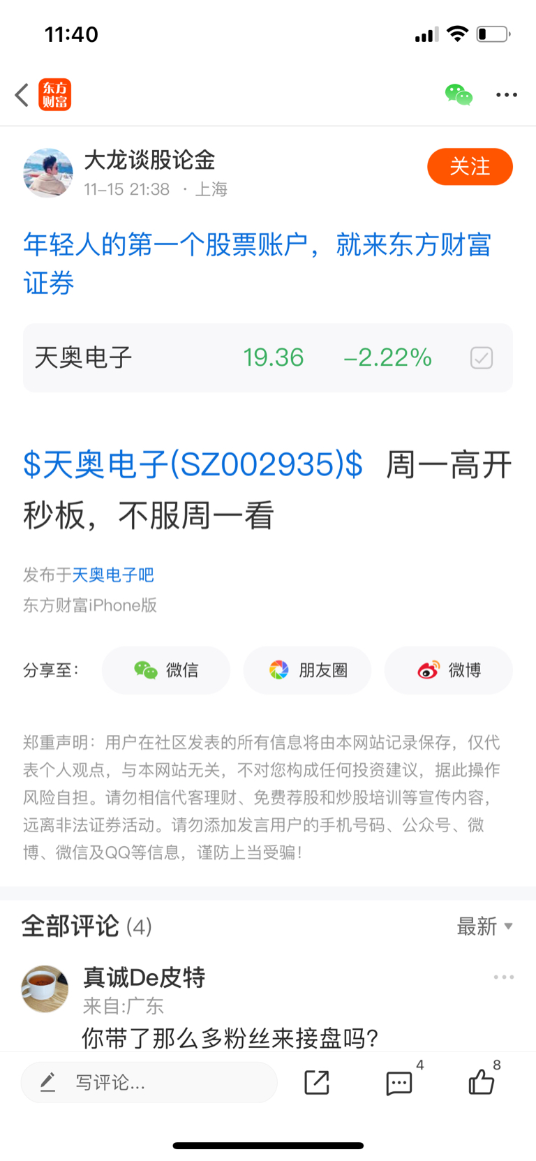 $天奥电子(SZ002935)$ 一万粉丝的大V居然在放量大阴线的时候说第二天高开秒板?