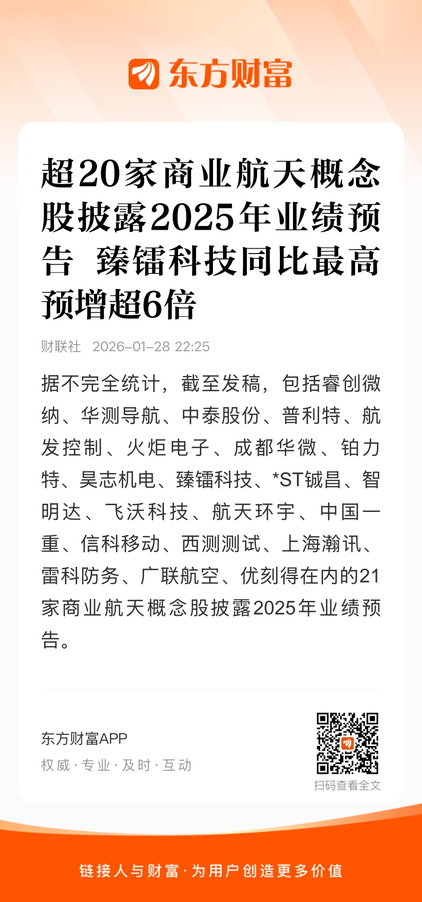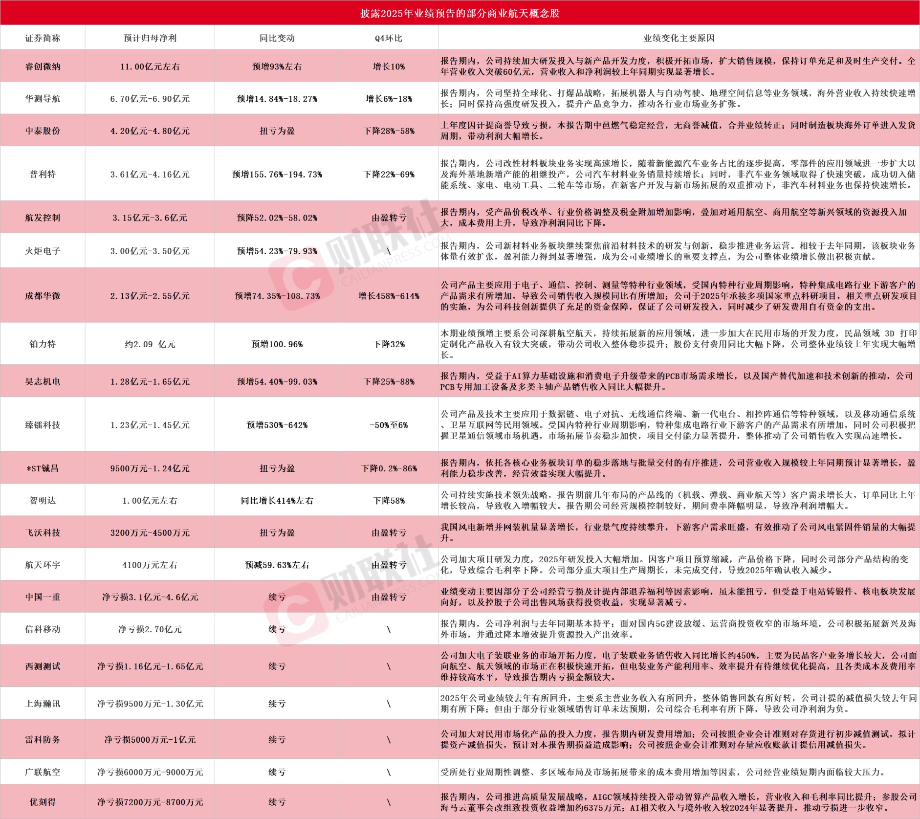 据不完全统计,截至发稿,包括睿创微纳、华测导航、中泰股份、普利特、航发控制、火炬电子、成都华微、铂力特、昊志机电、臻镭科技、*ST铖昌、智明达、飞沃科技、航天环宇、中国一重、信科移动、西测测试、上海瀚讯、雷科防务、广联航空、优刻得在内的21家商业航天概念股披露2025年业绩预告。其中,臻镭科技2025年净利同比预增530%-642%,智明达2025年净利同比预增414%左右。环比表现方面,成都华微Q4环比增长458%-614%。