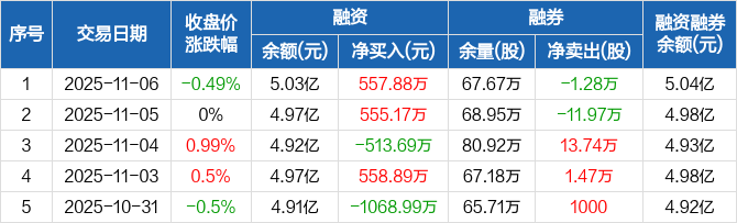 郑州银行:融资净买入557.88万元,融资余额5.03亿元(11-06)