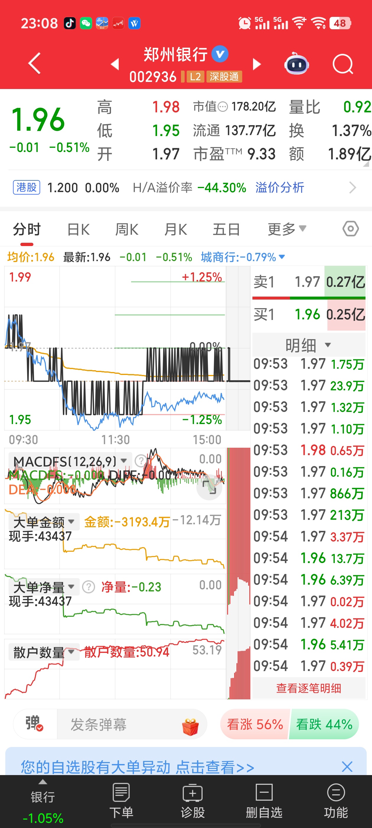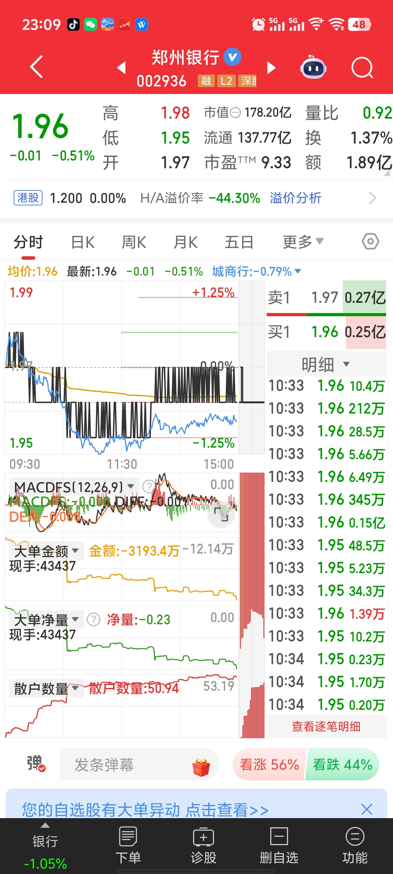 $郑州银行(SZ002936)$ 主力财投大股东现在都在每天都在砸盘几个亿出货,现在都是散户在接盘,说到底就是和财投大股东联合打压股价赚钱,就会低买高卖的来来回回买卖收割散户,快点跑呀还得跌先别进去接盘被套着就很麻烦了