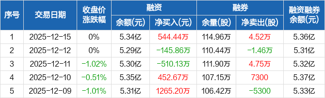 融资方面,当日融资买入1501.25万元,融资偿还956.82万元,融资净买入544.44万元。融券方面,融券卖出5.35万股,融券偿还8300股,融券余量114.96万股,融券余额223.02万元。融资融券余额合计5.36亿元。