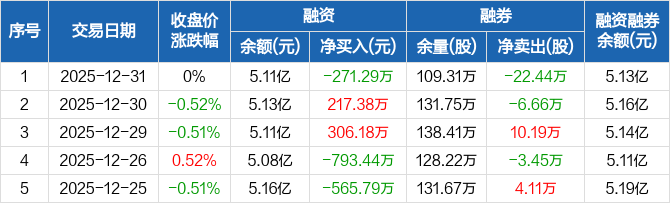 郑州银行:融资净偿还271.29万元,融资余额5.11亿元(12-31)