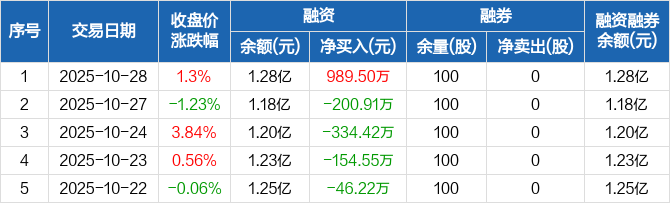 融资方面,当日融资买入1597.87万元,融资偿还608.36万元,融资净买入989.5万元。融券方面,融券卖出0股,融券偿还0股,融券余量100股,融券余额1865元。融资融券余额合计1.28亿元。
