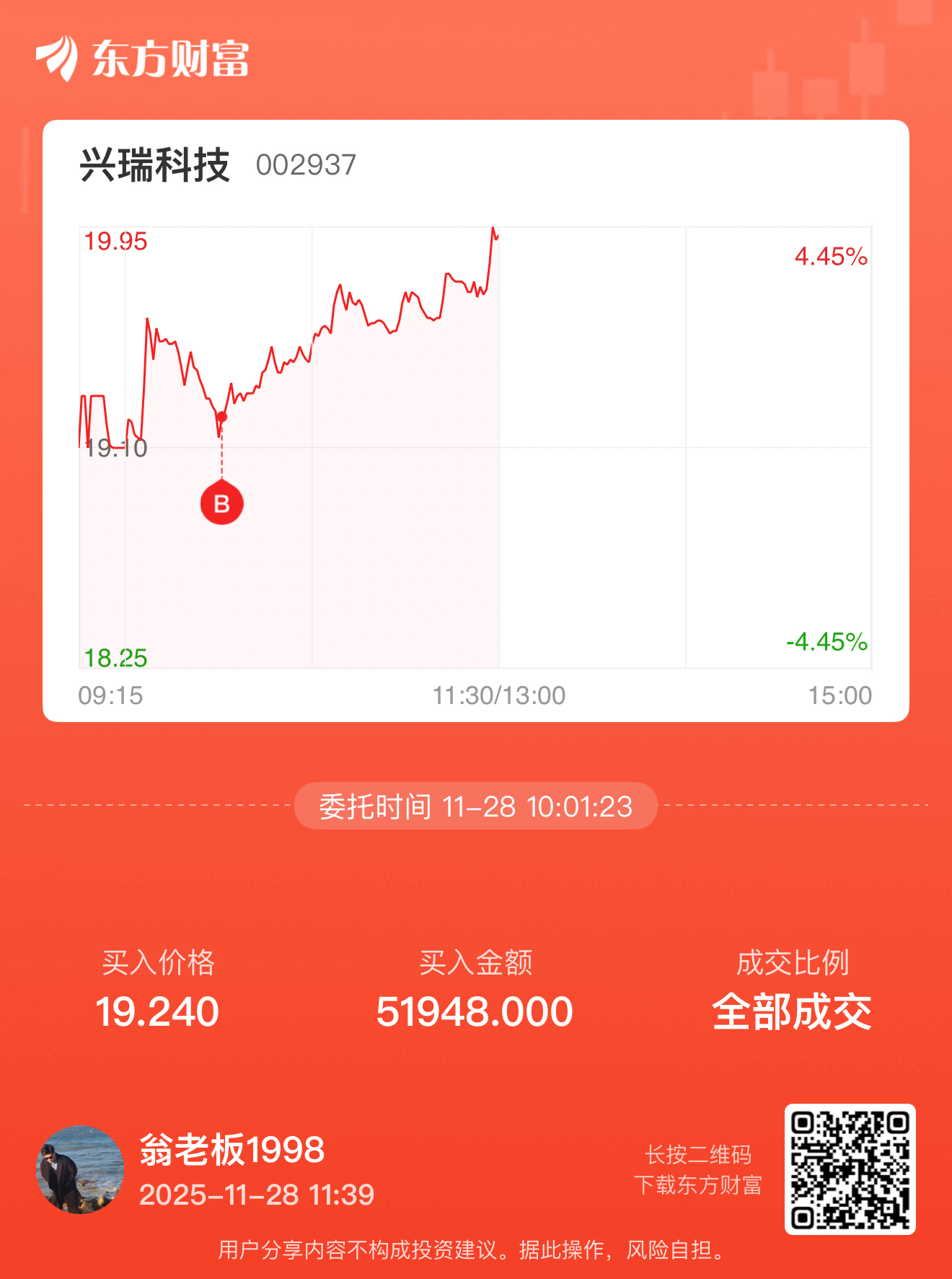 $兴瑞科技(SZ002937)$ 早上进场,买了两次