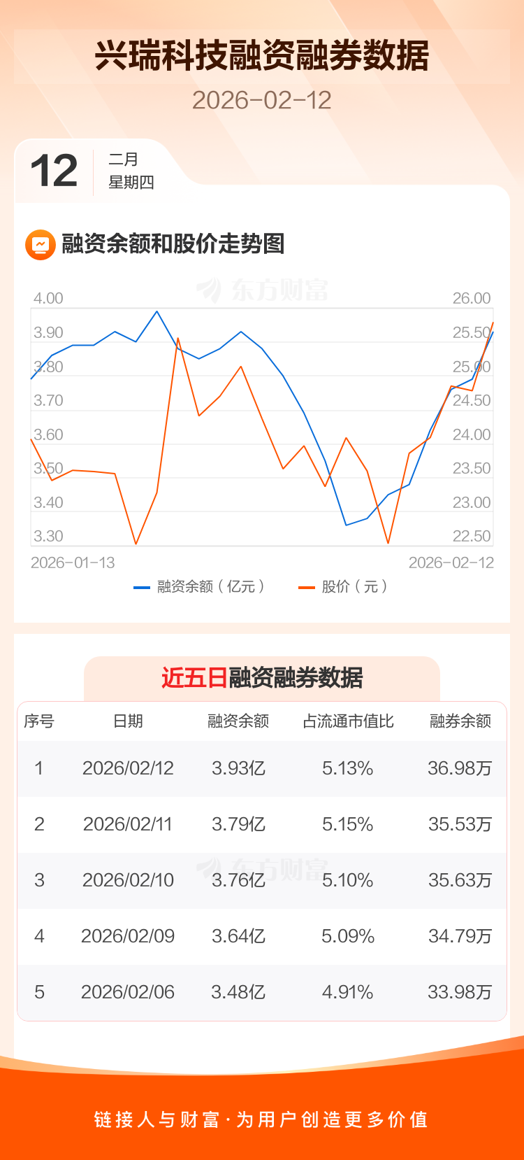 交易所最新数据显示,兴瑞科技于2026年2月12日获融资买入5651.26万元,融资偿还4282.54万元,当日融资净买入1368.72万元。目前,该股融资余额3.93亿,占流通市值比例为5.13%。