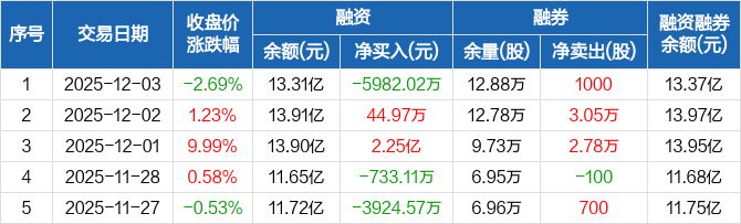 鹏鼎控股:融资净偿还5982.02万元,融资余额13.31亿元(12-03)
