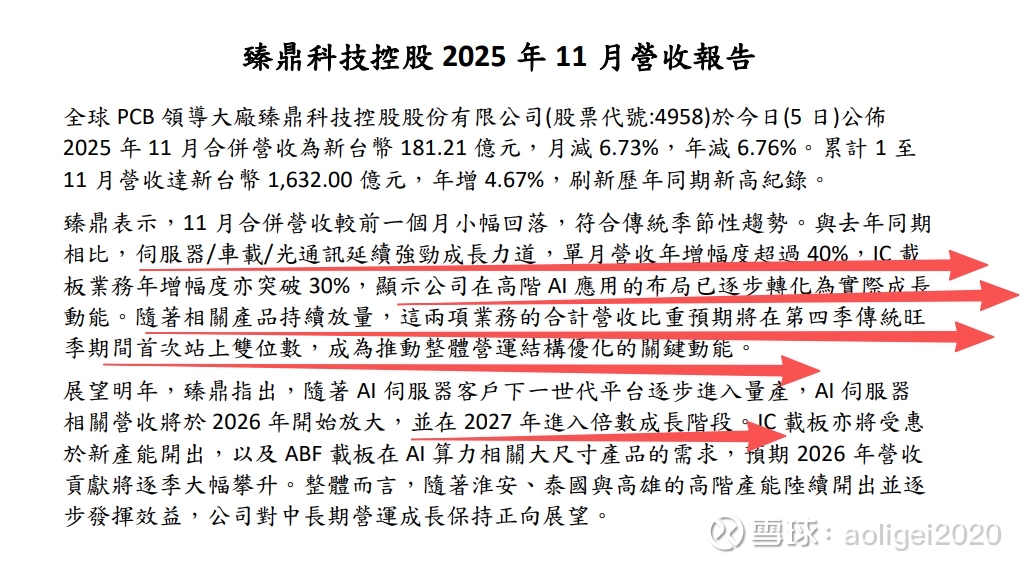 $鹏鼎控股(SZ002938)$ 预计四季度高附加值板块占比达到双位数,即10%以上,而前三季度占比仅5%,说明产品结构得到明显优化。重点是,AI服务器相关营收将于2026 年开始放大,并在2027年进入倍数成长阶段