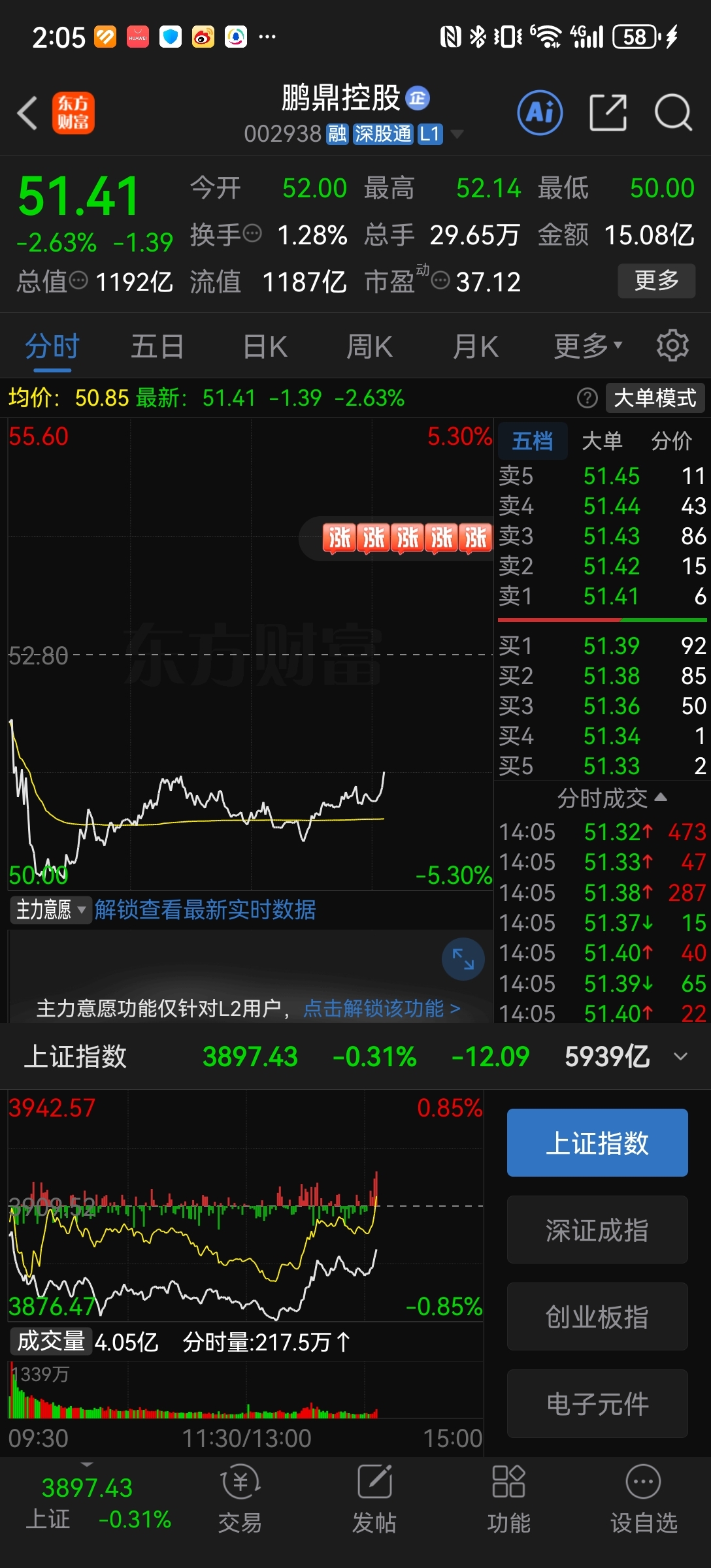 $鹏鼎控股(SZ002938)$ 和大盘看齐!!