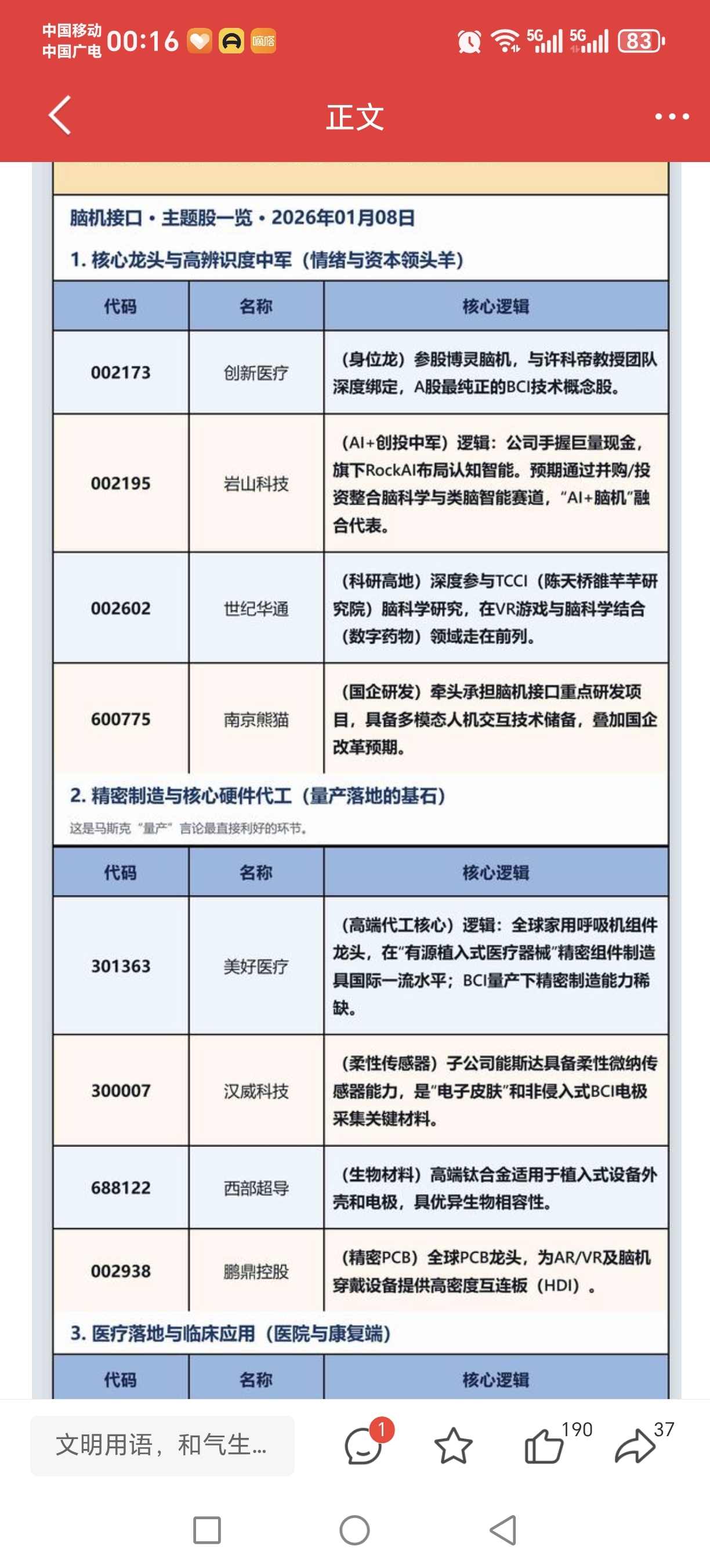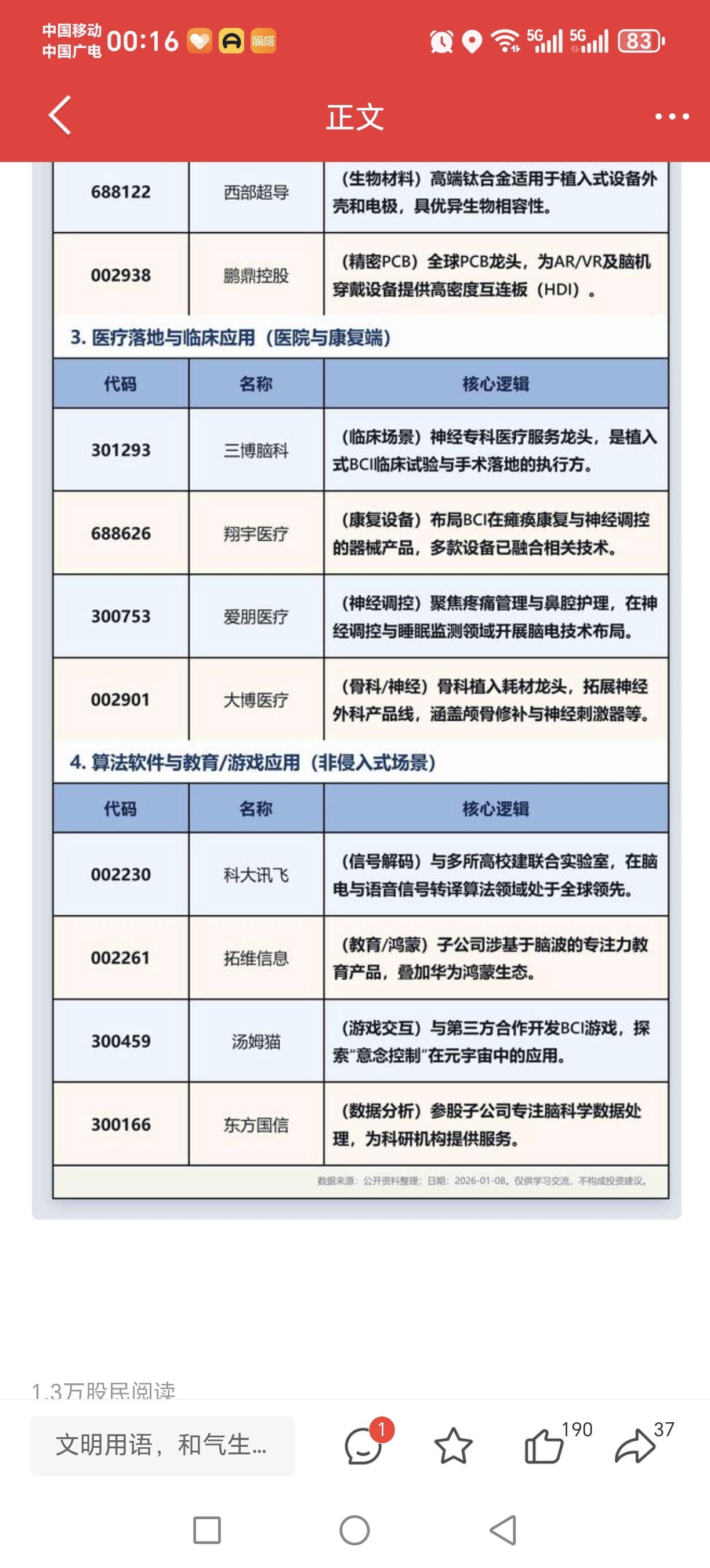 $鹏鼎控股(SZ002938)$ 马斯克Neuralink拟2026Q3实现全自动植入、成本降60%,叠加CES2026国产“意念控制”上车与国产超声波BCI三期临床获批,产业从实验走向量产与落地。受益标的涵盖技术龙头与制造、医疗、算法:创新医疗、岩山科技、美好医疗、汉威科技、西部超导、鹏鼎控股、三博脑科、翔宇医疗、科大讯飞、南京熊猫等。