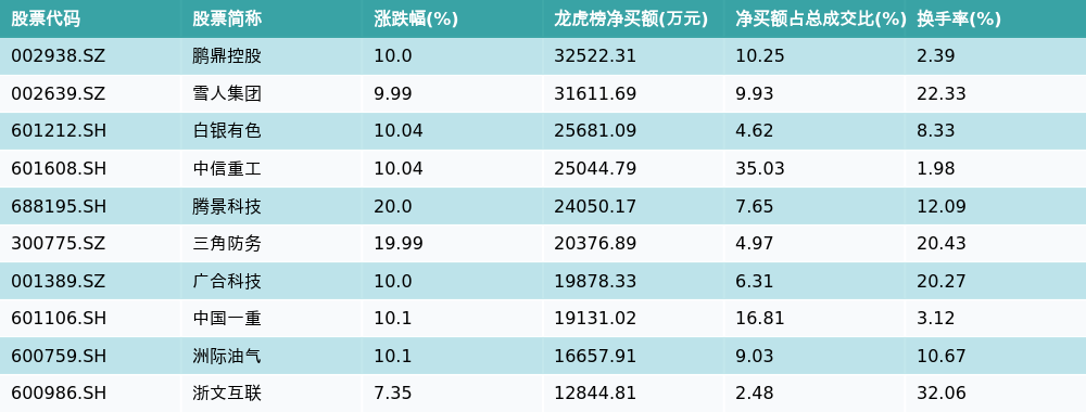 南财智讯1月22日电,南财金融终端数据显示,因当日异动登上龙虎榜的个股中,资金净买入最多的前三位分别是鹏鼎控股(002938.SZ)、雪人集团(002639.SZ)与白银有色(601212.SH)。其中排名第一的鹏鼎控股净买额达3.25亿元,占总成交金额的10.25%。鹏鼎控股当日收盘上涨10.0%,换手率为2.39%,净买入额前10个股详情见下图: