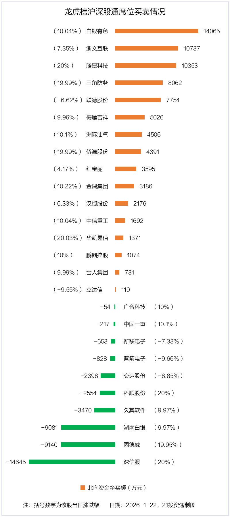 1月22日,北向资金参与龙虎榜中的个股共有26只,合计净买入3.58亿元。其中沪股通净买入9 股,净卖出3 股,合计净买入4.57亿元;深股通净买入7 股,净卖出7 股,合计净卖出9884.31万元。