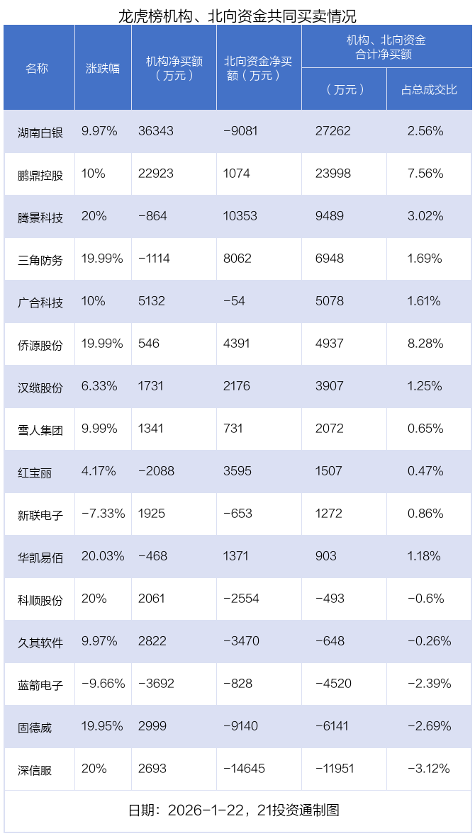 值得注意的是,机构和北向资金共同净买入了侨源股份、汉缆股份、鹏鼎控股、雪人集团等4股;共同净卖出了蓝箭电子;在腾景科技,三角防务,红宝丽,华凯易佰,广合科技,新联电子,科顺股份,久其软件,湖南白银,固德威,深信服上出现分歧,机构净卖出腾景科技863.87万元,北向资金净买入1.04亿元;机构净卖出三角防务1113.76万元,北向资金净买入8062.05万元;机构净卖出红宝丽2087.59万元,北向资金净买入3595万元;机构净卖出华凯易佰467.9万元,北向资金净买入1370.7万元;机构净买入广合科技5131.92万元,北向资金净卖出54.16万元;机构净买入新联电子1924.96万元,北向资金净卖出652.67万元;机构净买入科顺股份2061.21万元,北向资金净卖出2553.79万元;机构净买入久其软件2822.11万元,北向资金净卖出3469.93万元;机构净买入湖南白银3.63亿元,北向资金净卖出9081.32万元;机构净买入固德威2998.59万元,北向资金净卖出9140.05万元;机构净买入深信服2693.13万元,北向资金净卖出1.46亿元。