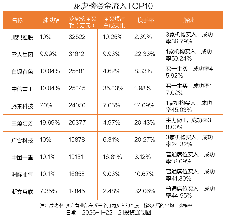 1月22日,上证指数上涨0.14%,深证成指上涨0.5%,创业板指上涨1.01%。盘后龙虎榜数据显示,共有51只个股因当日异动登上龙虎榜,资金净流入最多的是鹏鼎控股(002938.SZ),达3.25亿元。