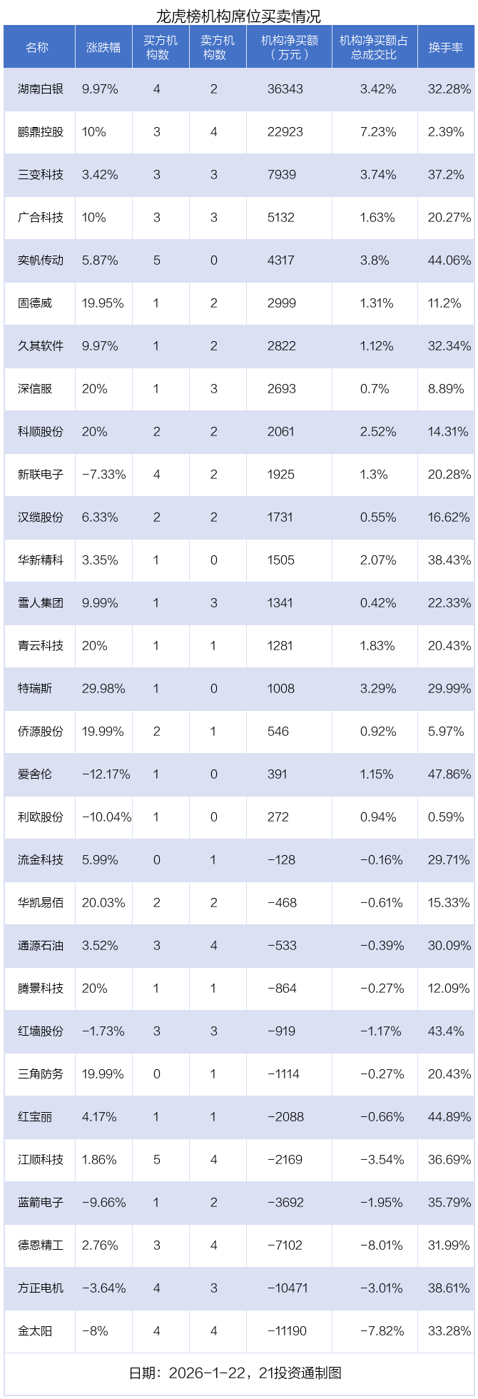 其中,机构净买入金额最多的是湖南白银(002716.SZ),当日收盘上涨9.97%,换手率为32.28%。