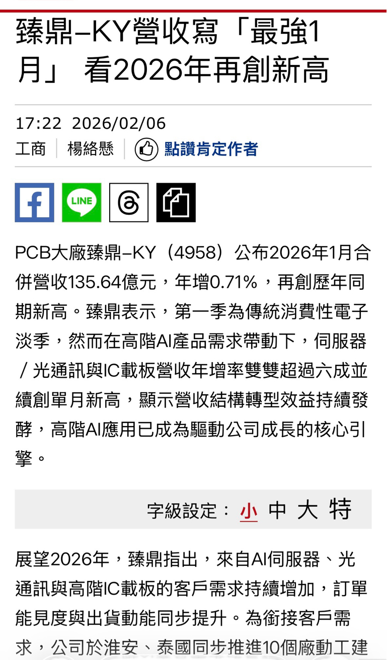 既然气氛都烘托到这了,也发下臻鼎公司的1月份的财报消息吧,和大A一样,今天臻鼎的