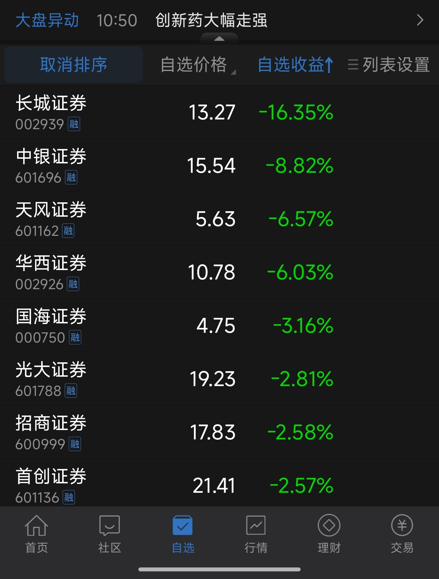$长城证券(SZ002939)$ 看图说话,自选证券领跌第一