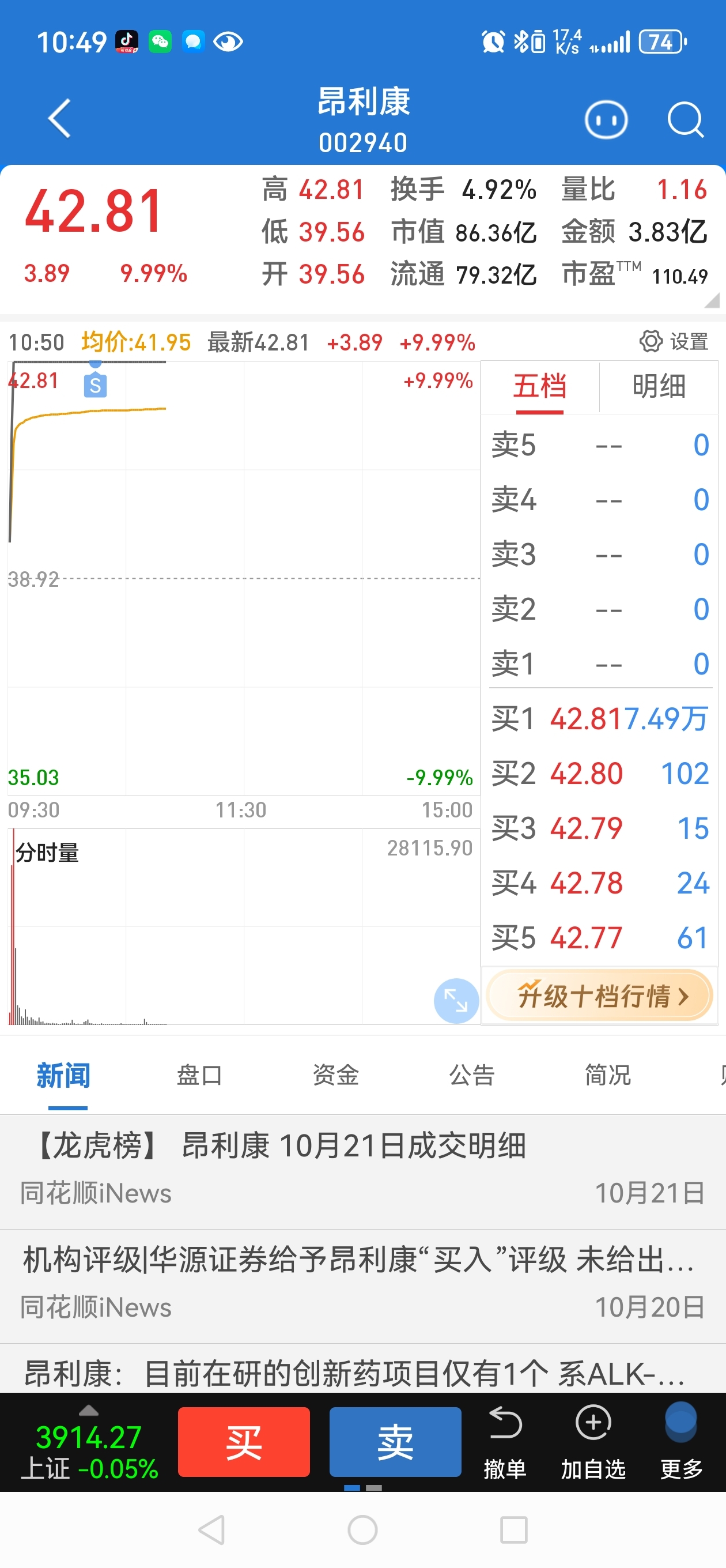 $昂利康(SZ002940)$ 昨天涨停不可能格局一点的