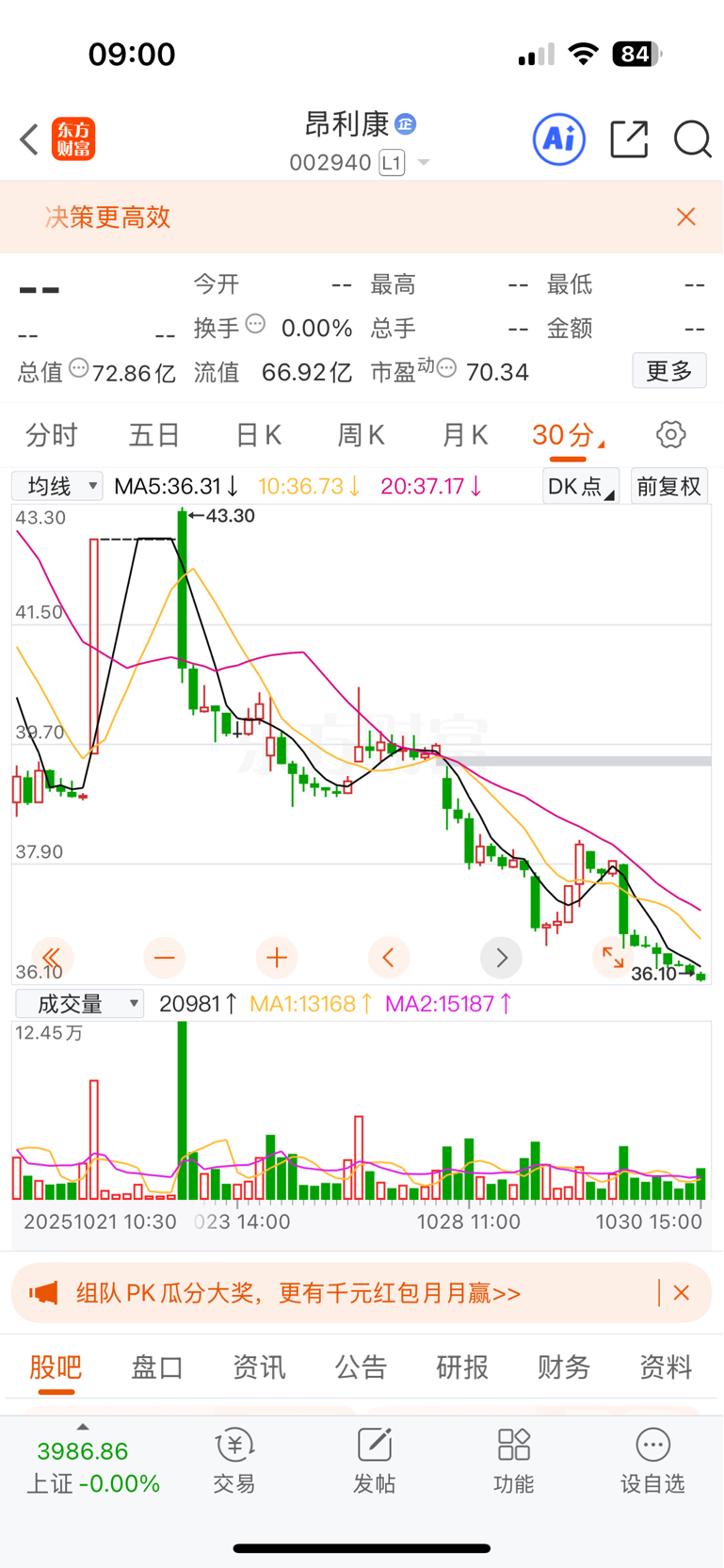 $昂利康(SZ002940)$ 你们看一下30分钟线,一路向下,,一定要控制自己,别被套,这个位置,,还是绝对高位……等企稳了再考虑,跟我一样就留一股,就好,等稳了再买,千万别被股吧的人忽悠,