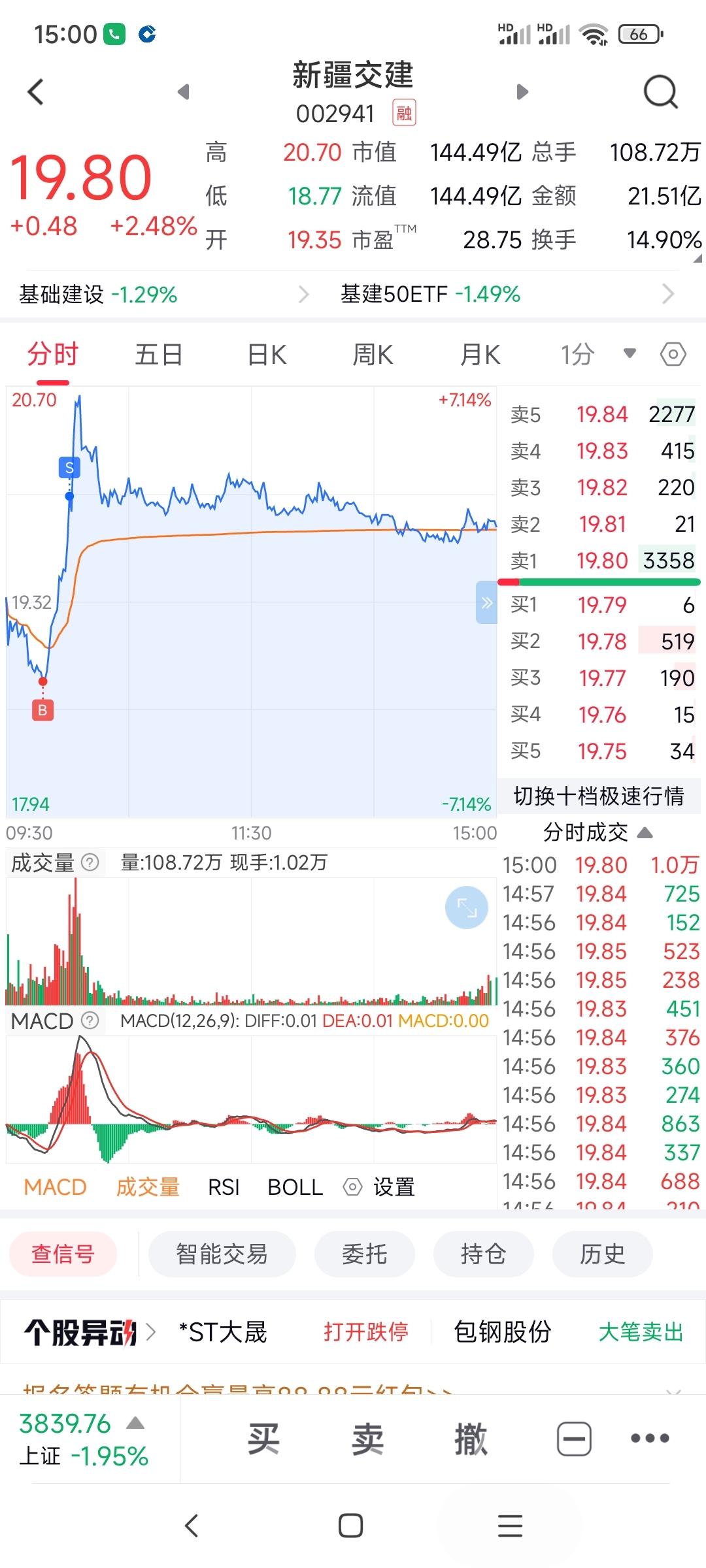 前两天21附近卖了点,今天跌到18.81看位置蛮低的先手接了点,到手挂了19.96和20.89卖单,很可惜第二笔20.89没出掉