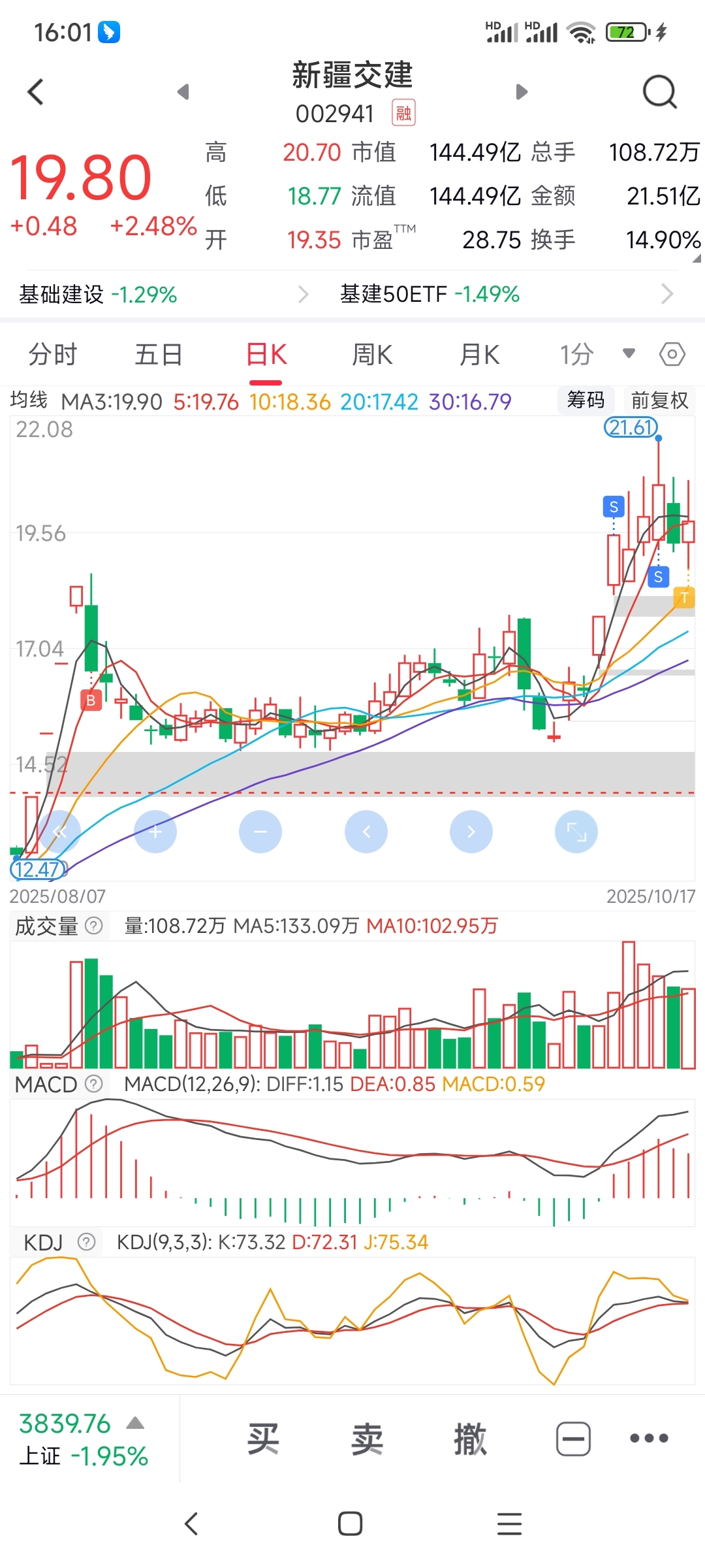 前两天21附近卖了点,今天跌到18.81看位置蛮低的先手接了点,到手挂了19.9