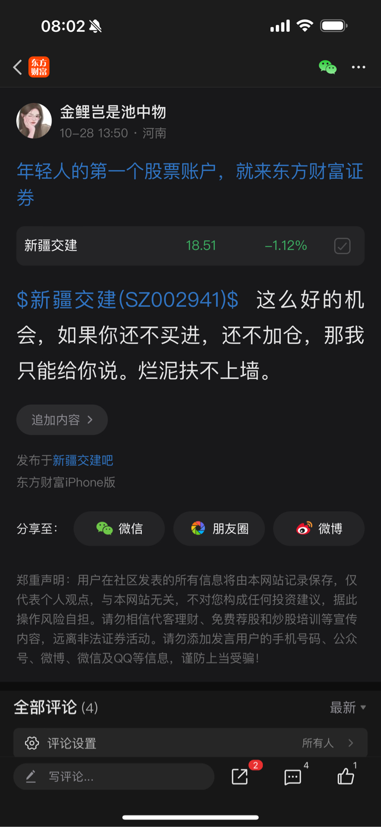 温馨提示: 1.根据《证券法》规定,禁止编造、传播虚假信息或者误导性信息,扰乱证券市场;2.用户在本社区发表的所有资料、言论等仅代表个人观点,与本网站立场无关,不对您构成任何投资建议。用户应基于自己的独立判断,自行决定证券投资并承担相应风险。《东方财富社区管理规定》