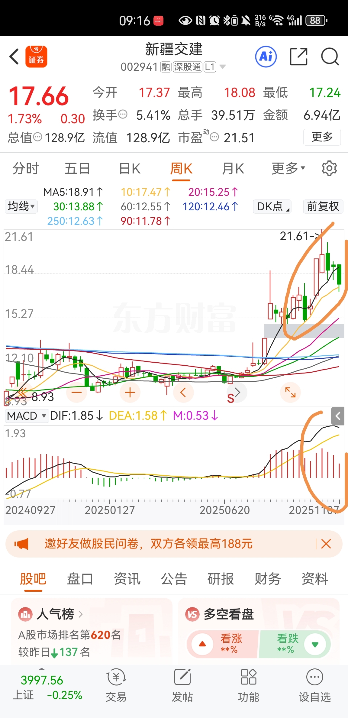$新疆交建(SZ002941)$ 周线级别的下跌才刚开始而已,周线严重顶背离。都不知道你们玩股票玩的什么?完全不懂股票的一群菜