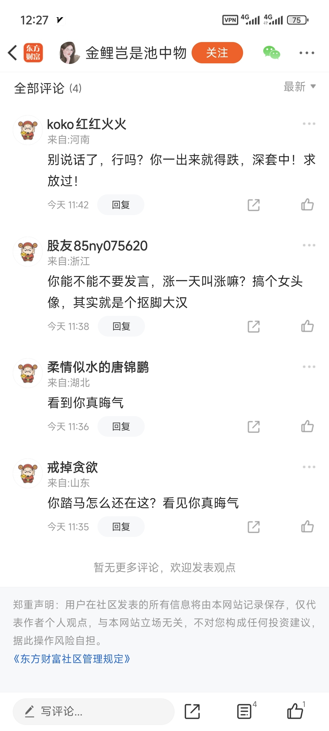 温馨提示: 1.根据《证券法》规定,禁止编造、传播虚假信息或者误导性信息,扰乱证券市场;2.用户在本社区发表的所有资料、言论等仅代表个人观点,与本网站立场无关,不对您构成任何投资建议。用户应基于自己的独立判断,自行决定证券投资并承担相应风险。《东方财富社区管理规定》