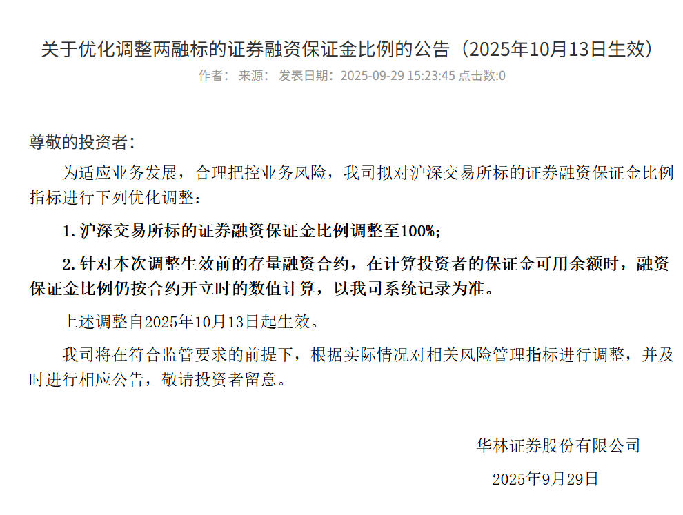 公告显示,为适应业务发展,合理把控业务风险,华林证券对沪深交易所标的证券融资保证金比例指标进行优化调整。将沪深交易所标的证券融资保证金比例调整至100%;针对本次调整生效前的存量融资合约,在计算投资者的保证金可用余额时,融资保证金比例仍按合约开立时的数值计算。调整自2025年10月13日起生效。