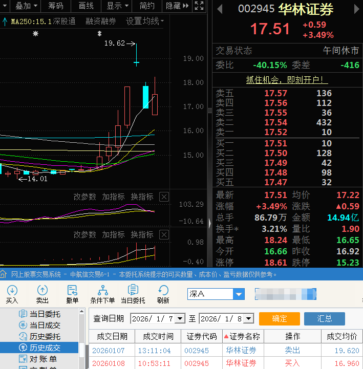 002945华林证券周三午后开盘13:11分04秒两连板涨停价卖出后就立马打开,