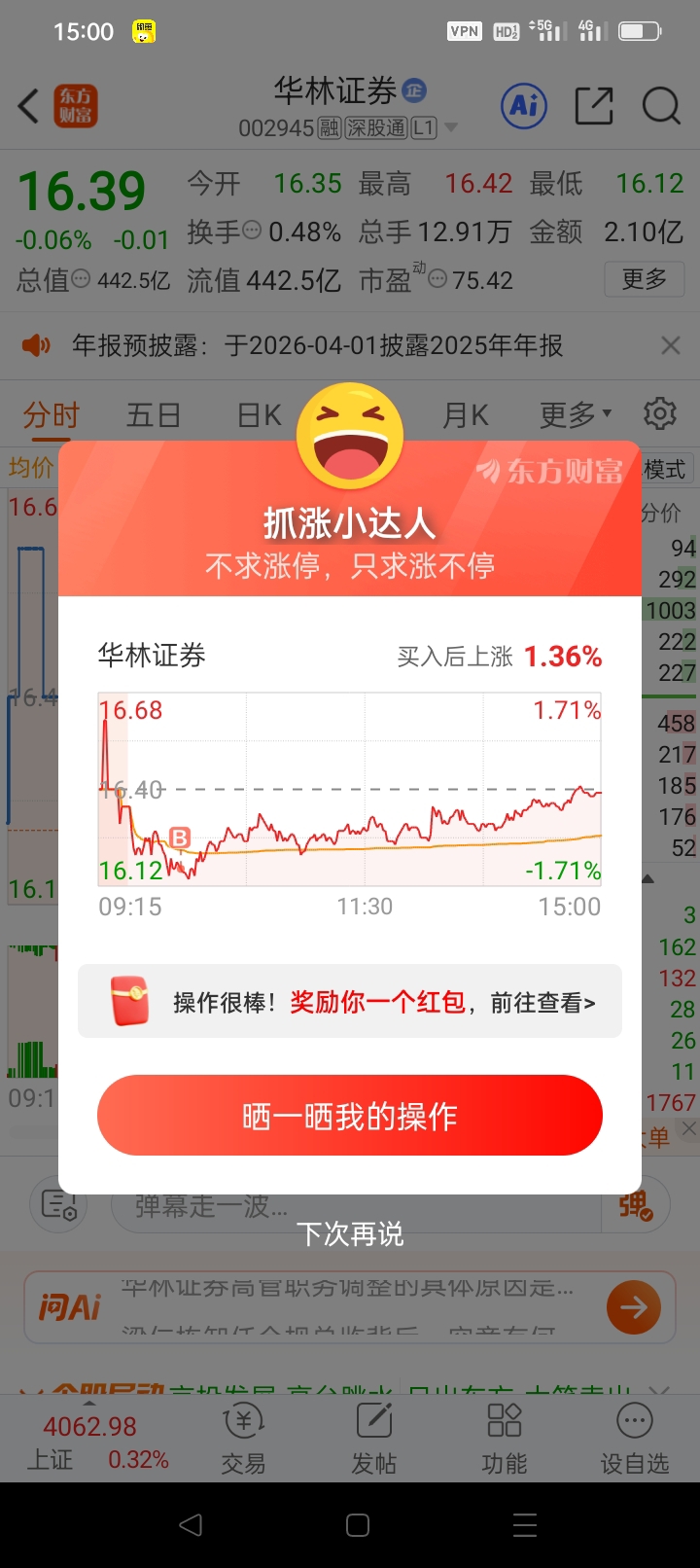 $华林证券(SZ002945)$ 明天来根大阳线就稳了
