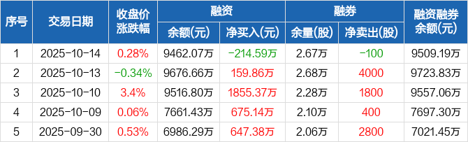新乳业:融资净偿还214.59万元,融资余额9462.07万元(10-14)
