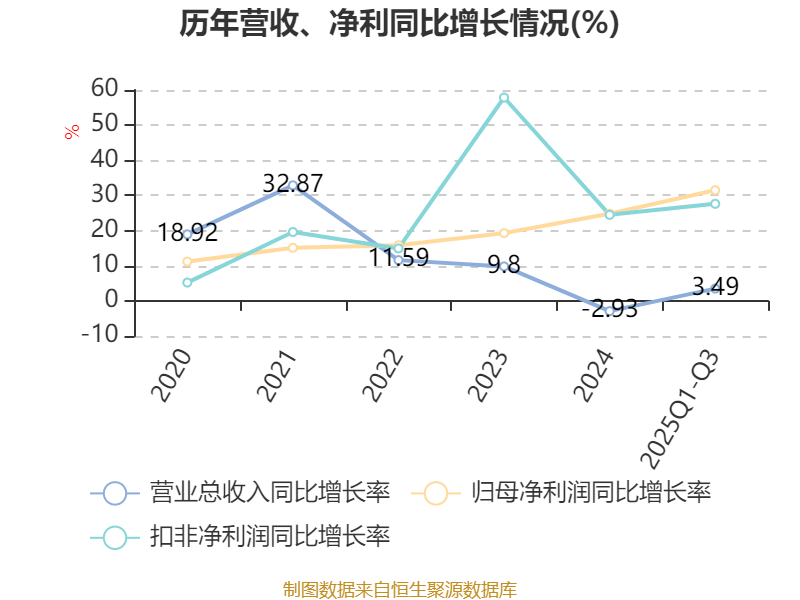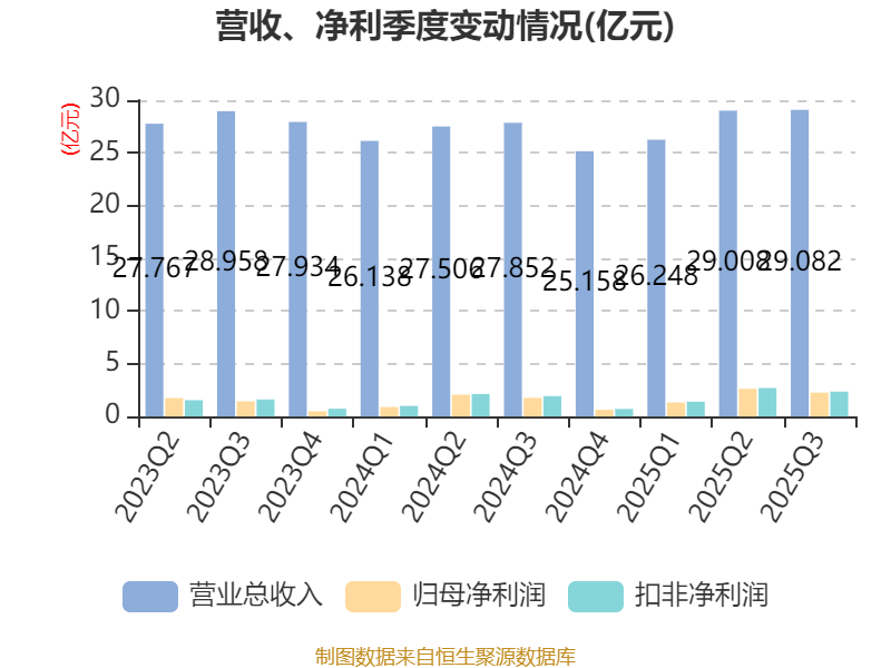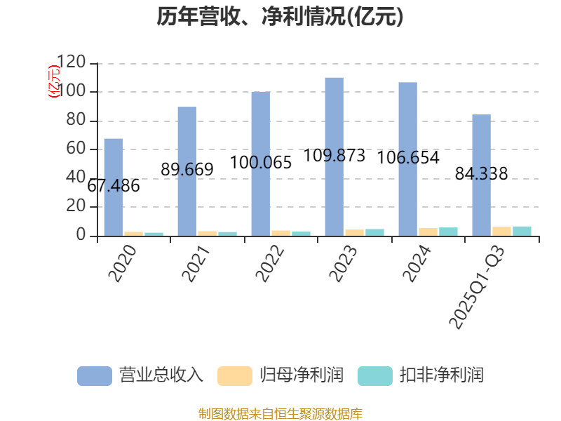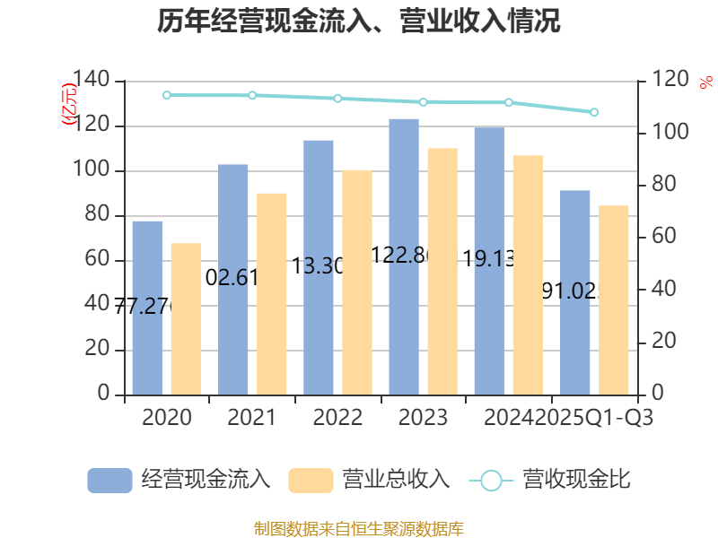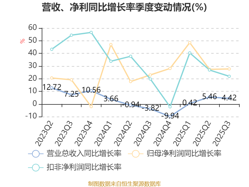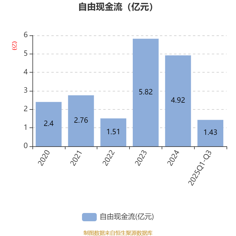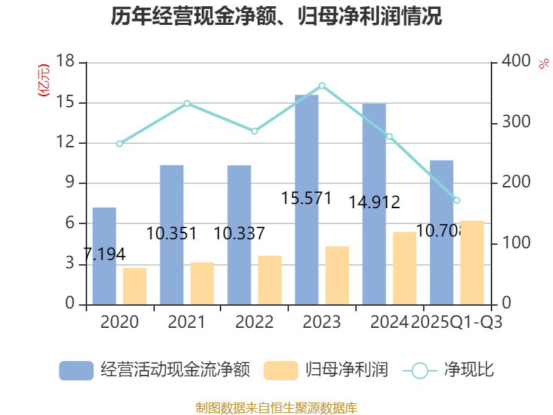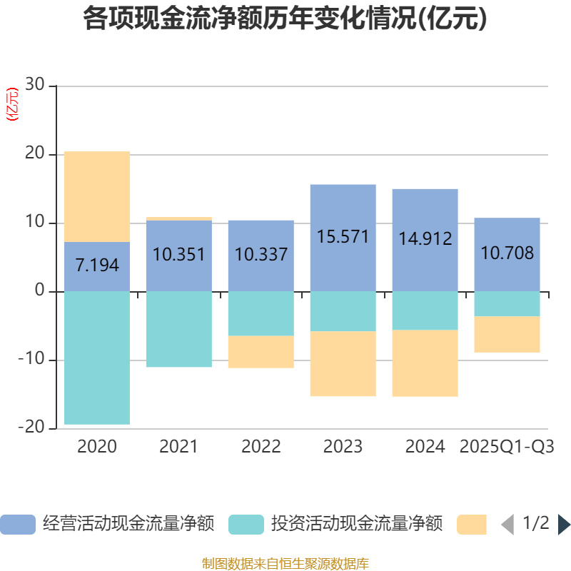 2025年前三季度,公司经营活动现金流净额为10.71亿元,同比增长7.02%;筹资活动现金流净额-5.26亿元,同比增加4389.63万元;投资活动现金流净额-3.69亿元,上年同期为-4.59亿元。