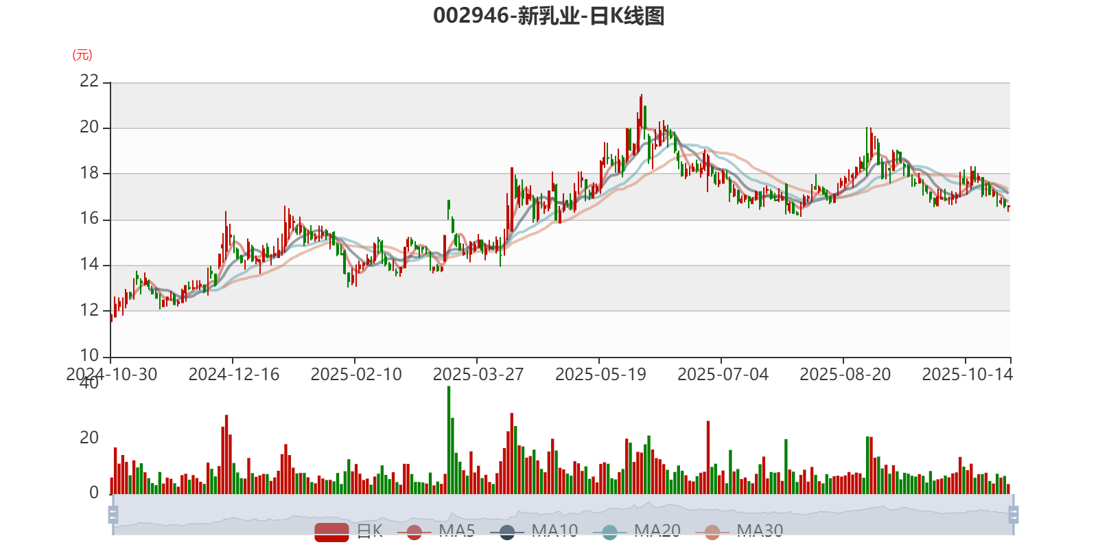 中证智能财讯新乳业(002946)10月30日披露2025年第三季度报告。前三季度公司实现营业总收入84.34亿元,同比增长3.49%;归母净利润6.23亿元,同比增长31.48%;扣非净利润6.47亿元,同比增长27.62%;经营活动产生的现金流量净额为10.71亿元,同比增长7.02%;报告期内,新乳业基本每股收益为0.72元,加权平均净资产收益率为18.34%。
