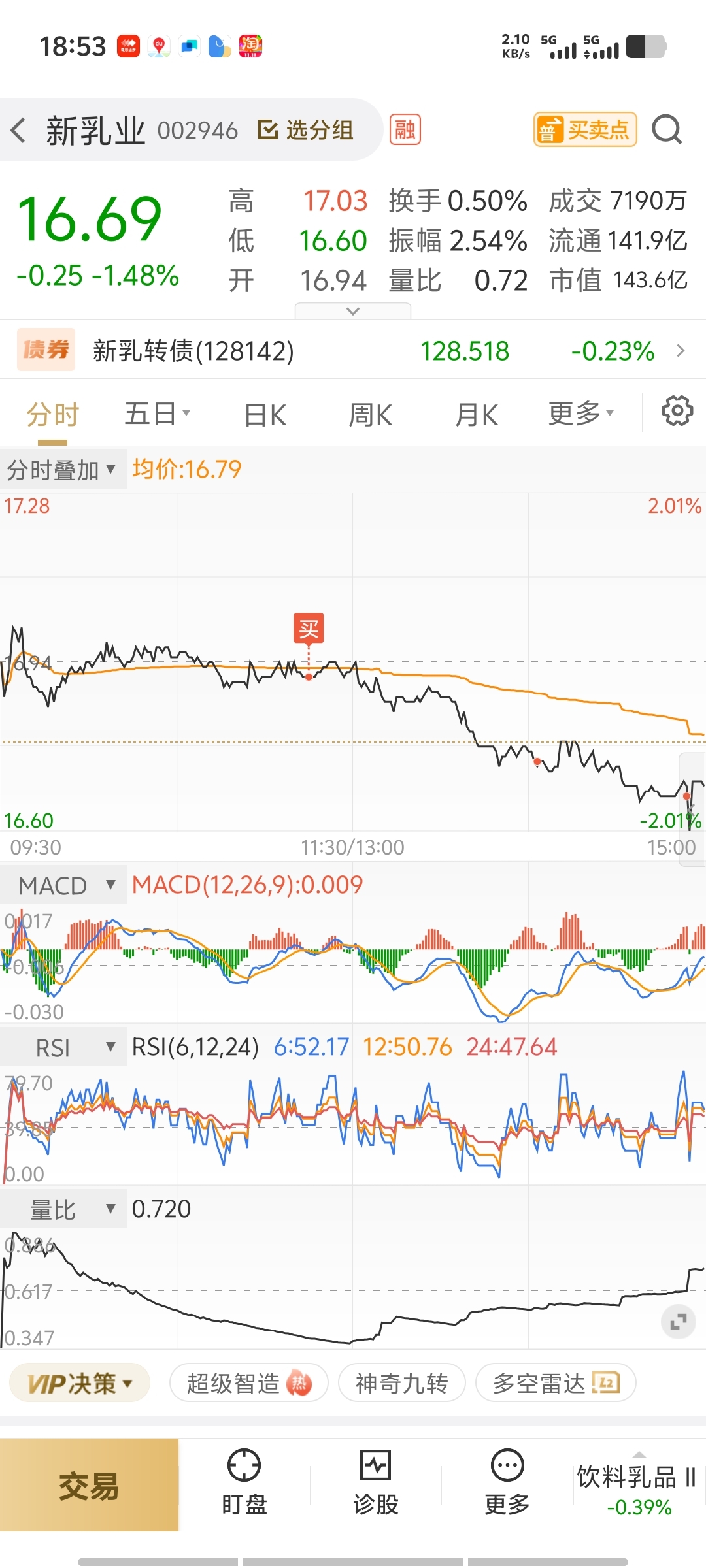 $新乳业(SZ002946)$ 越跌越买,下个星期吃肉