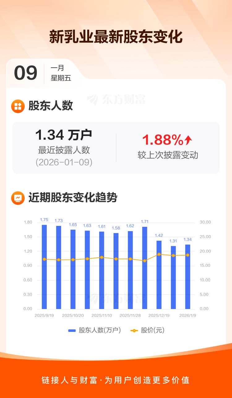 新乳业:截至1月9日最新股东户数1.34万户,较上期增加1.88%