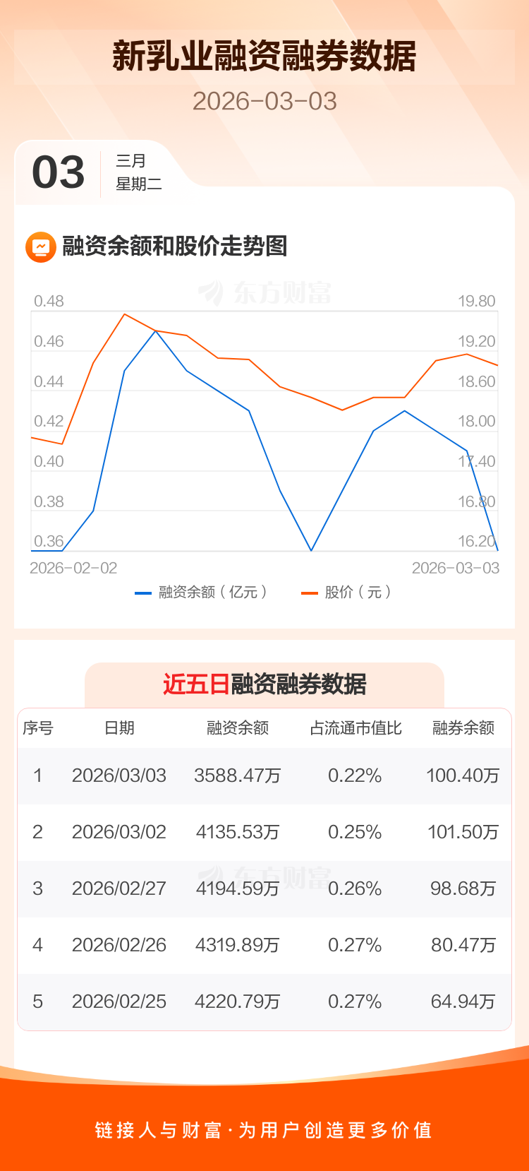 交易所最新数据显示,新乳业于2026年3月3日获融资买入451.28万元,融资偿还998.34万元,当日融资净偿还547.06万元。目前,该股融资余额3588.47万,占流通市值比例为0.22%。