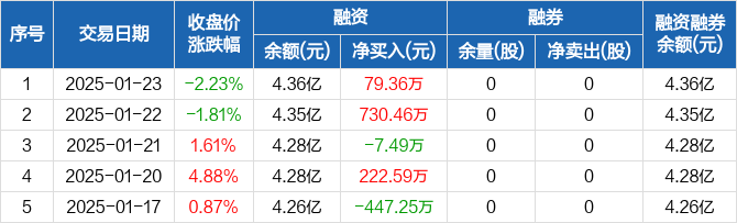 恒铭达:融资余额4.36亿元,创历史新高(01-23)