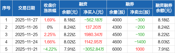 恒铭达:融资净偿还562.18万元,融资余额8.18亿元(11-27)