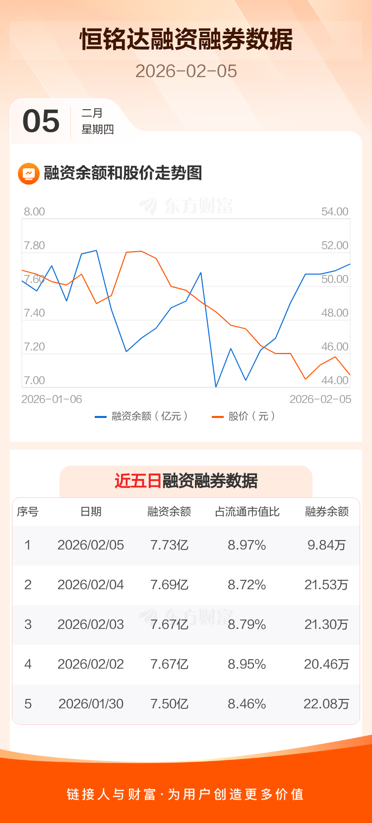 交易所最新数据显示,恒铭达于2026年2月5日获融资买入2455.76万元,融资偿还2080.51万元,当日融资净买入375.25万元。目前,该股融资余额7.73亿,占流通市值比例为8.97%。