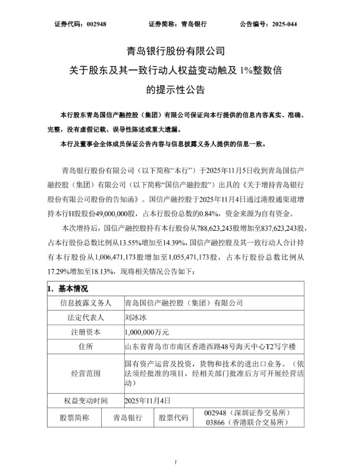 11月6日,青岛银行公告称,当日收到青岛国信产融控股(集团)有限公司出具的《关于增持青岛银行股份有限公司股份的告知函》。