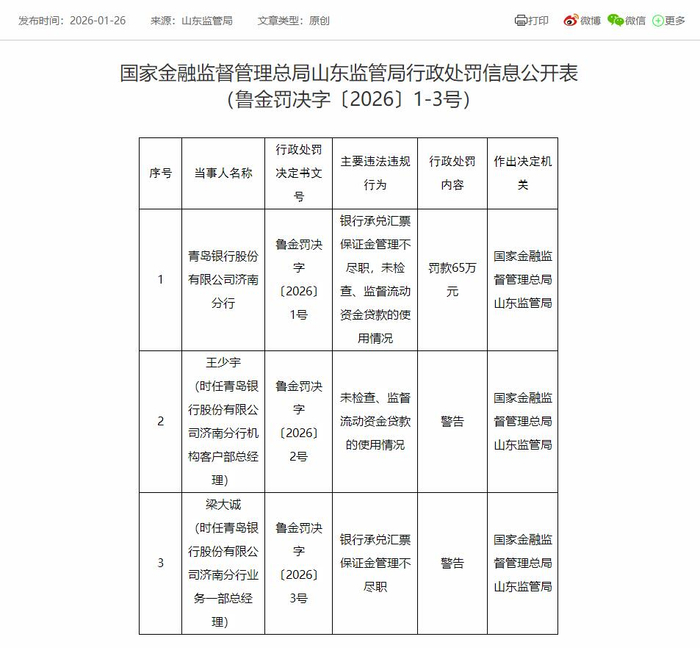 近日,据国家金融监督管理总局山东监管局行政处罚信息公开表显示,青岛银行因主要存在“银行承兑汇票保证金管理不尽职,未检查、监督流动资金贷款的使用情况”违法违规行为,被罚款65万元。同时,对相关责任人时任对时任青岛银行济南分行机构客户部总经理王少宇和时任青岛银行济南分行业务一部总经理梁大诚予以警告。