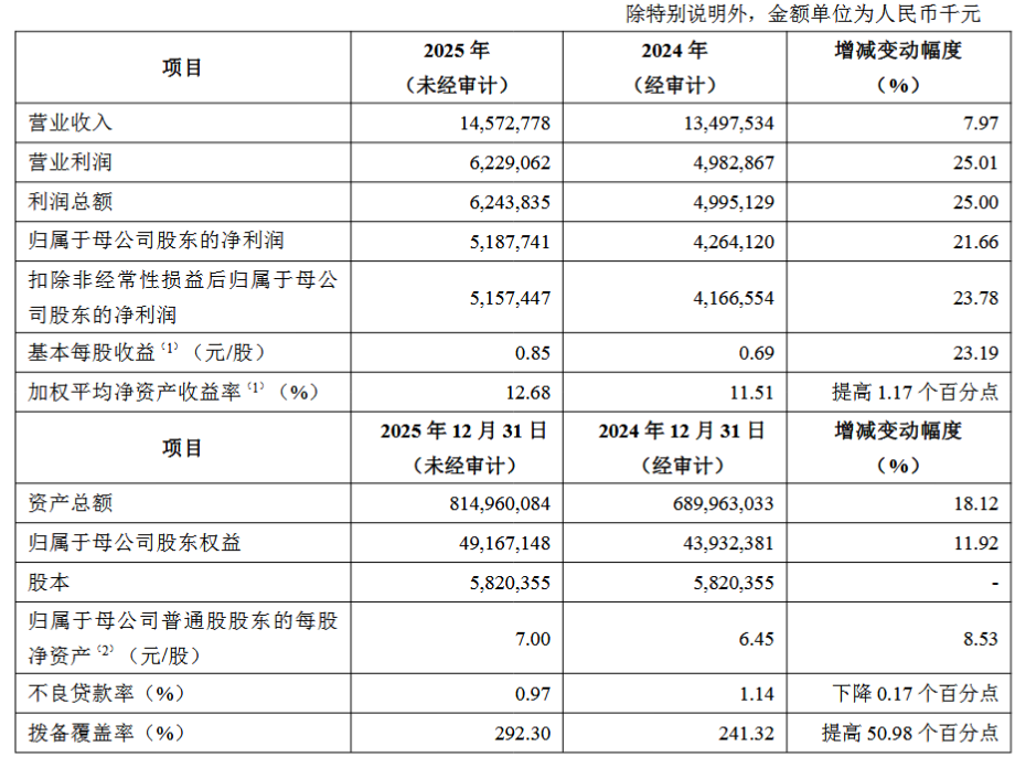 1月28日,青岛银行(002948/03866)发布公告,2025年度业绩快报显示,公司的营业收入为145.73亿元,同比增长7.97%;归母净利润51.9亿元,同比增长21.66%,具体如下: