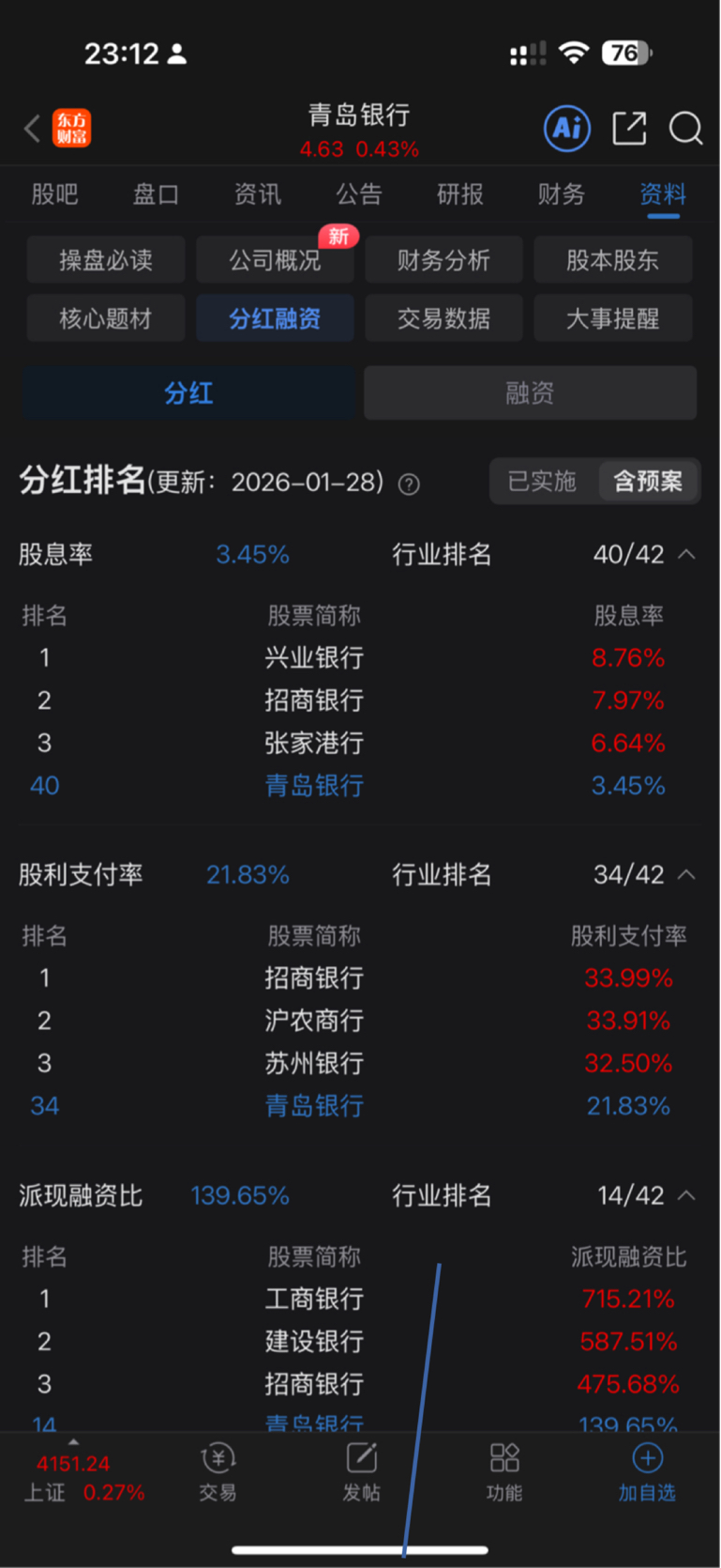 $青岛银行(SZ002948)$ 青岛银行没有中期分红,股息率3.45%,42家银行中排第40名。股息率最高的是兴业银行,8.76%,兴业即将中期分红。