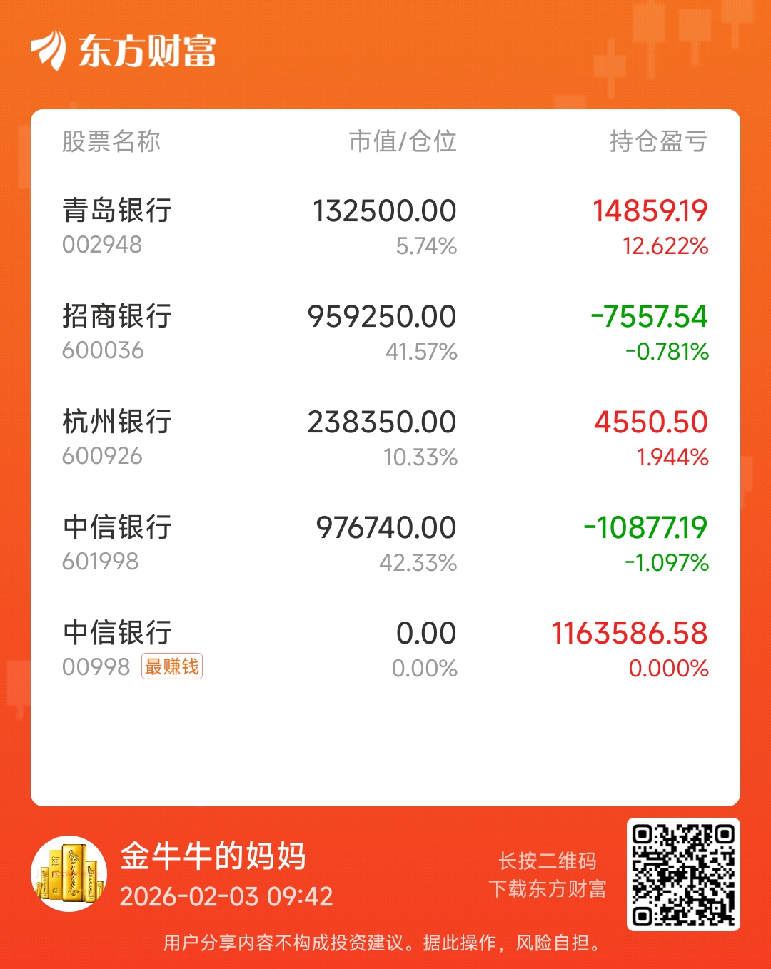 $招商银行(SH600036)$ $中信银行(SH601998)$ $杭州银行(SH600926)$ #炒股日记# #实盘记录# #投资随笔# 调仓完成后,每年股息将从10万元增加到11万元。
