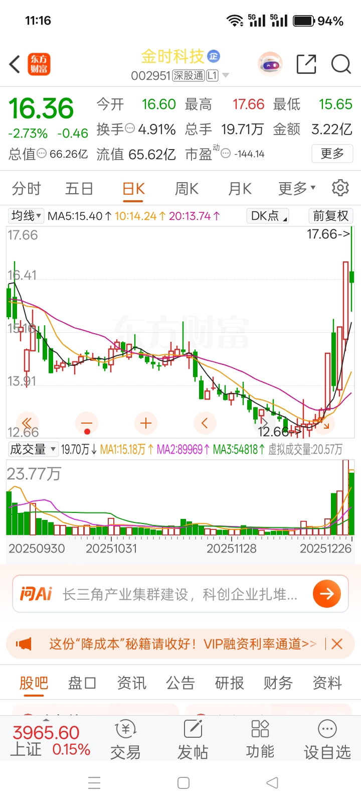 $金时科技(SZ002951)$ 昨天15附近进的朋友,目前其余部分可以全部落地出局,上影线太长,压力位大,暂时先出局!等待低位信号!