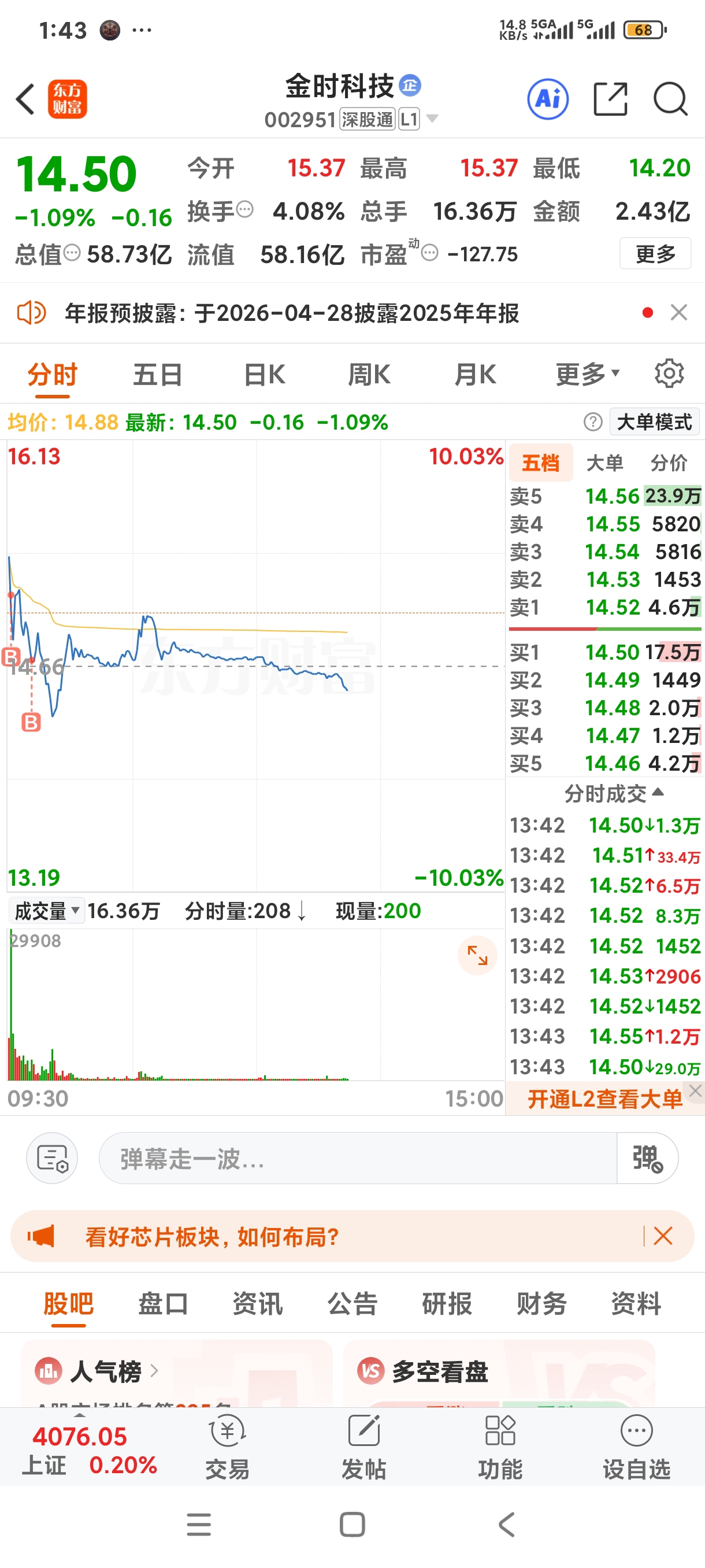 $金时科技(SZ002951)$ 15块钱的成本,明天可以解套跑路吗?今年追高进来的。
