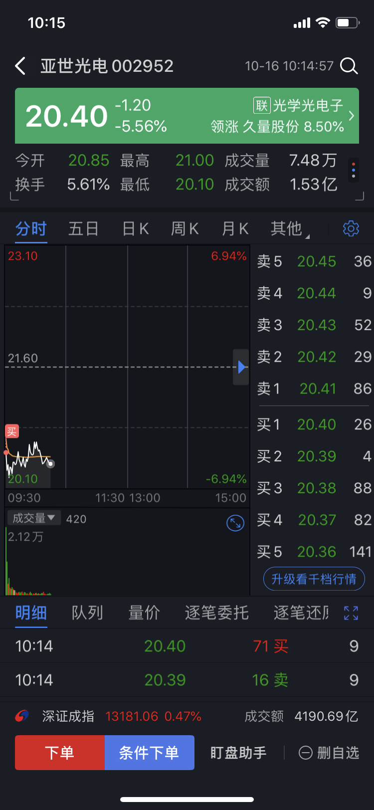 $亚世光电(SZ002952)$ 集合竞价买入被套了,等再跌10%左右补一下仓。游资三日游行情结束了。