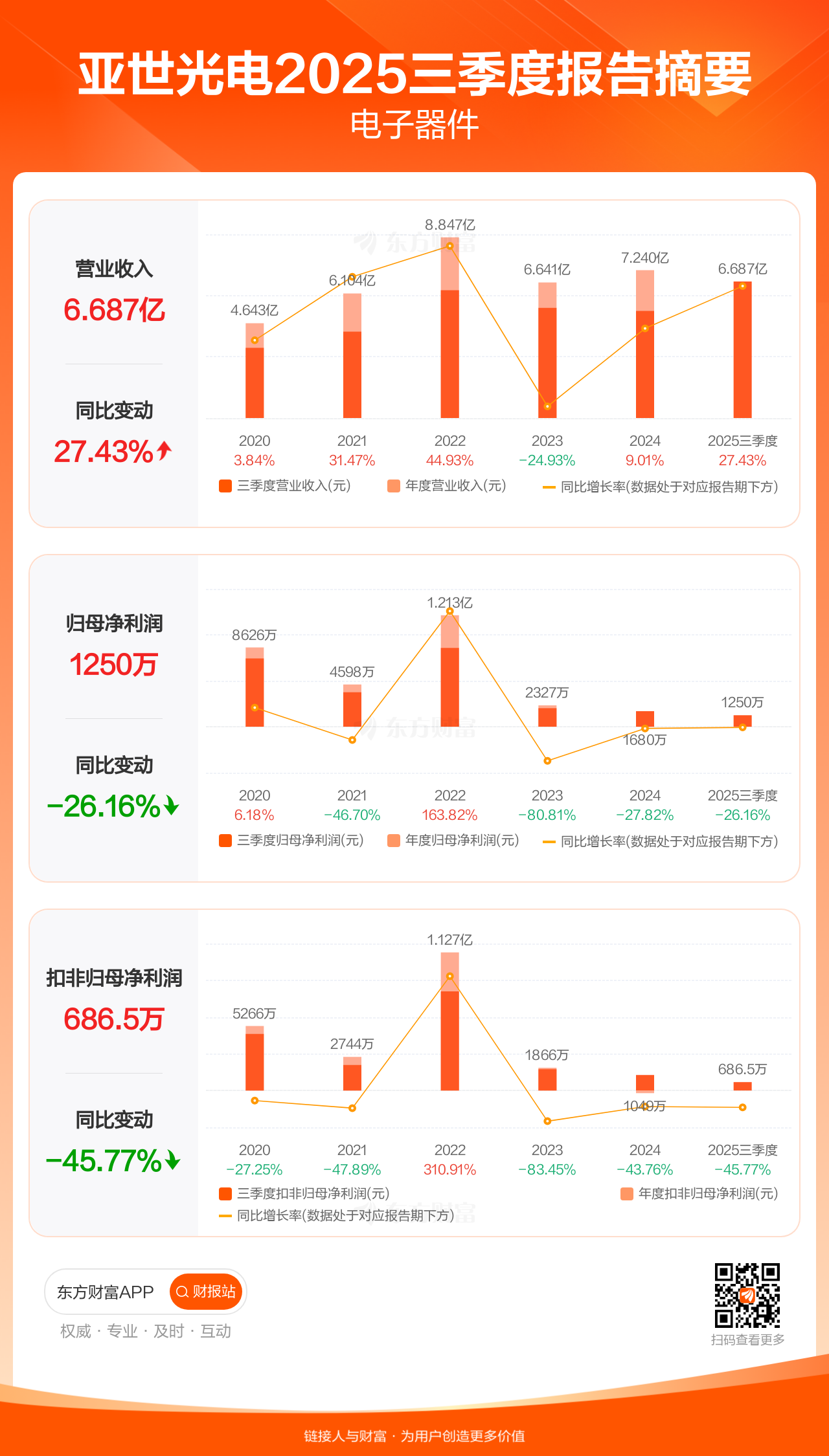 亚世光电10月29日发布2025年三季报显示,公司前三季实现营业收入6.69亿元,同比增长27.43%;归母净利润1249.61万元,同比下滑26.16%;扣非归母净利润686.52万元,同比下滑45.77%。